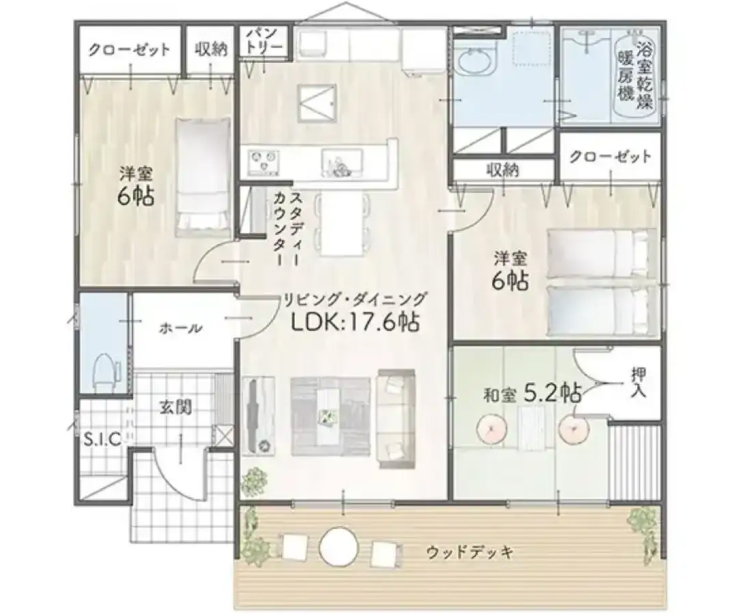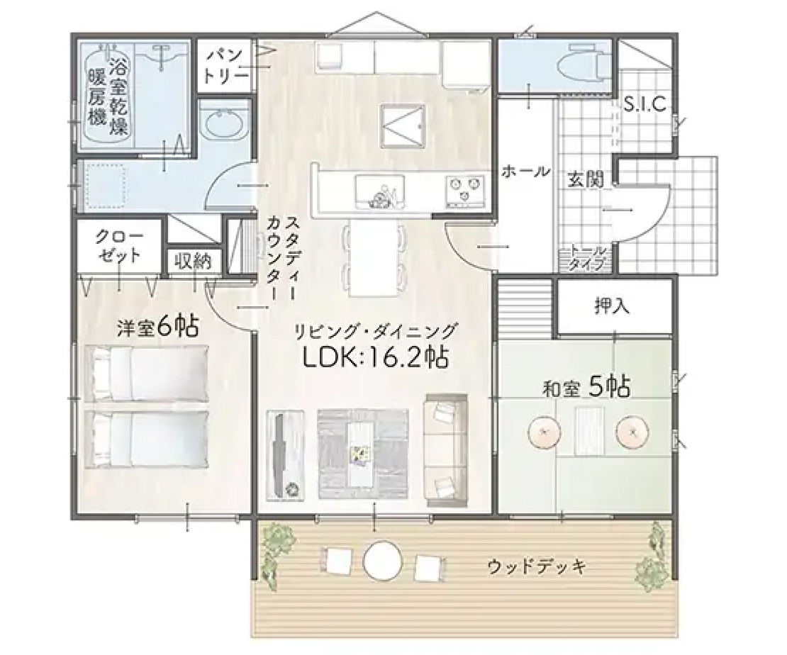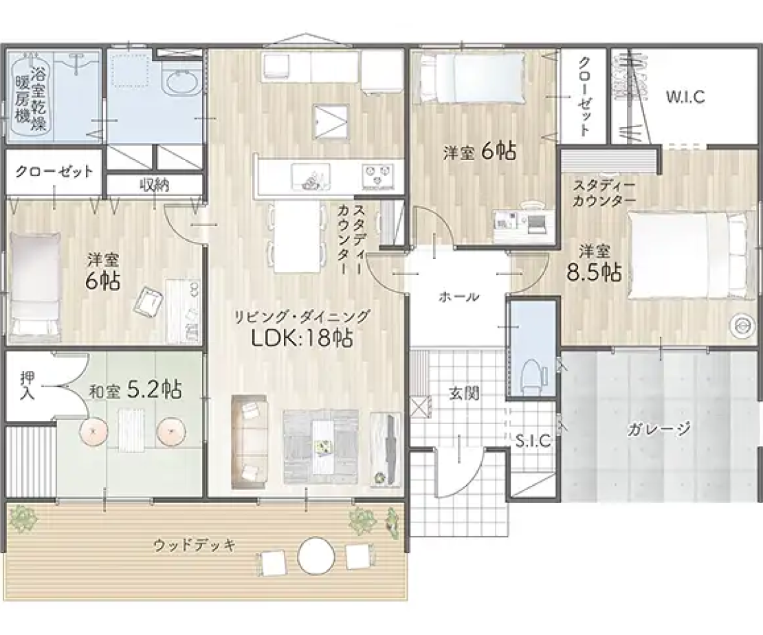 明るい玄関アプローチから、四季を感じられる南向きの開放的なLDKは家族団らんの場。客間にも最適な和室を備え、各部屋に収納を確保した快適な居住空間です。