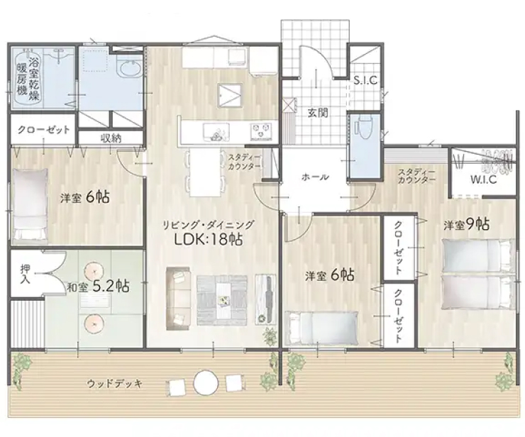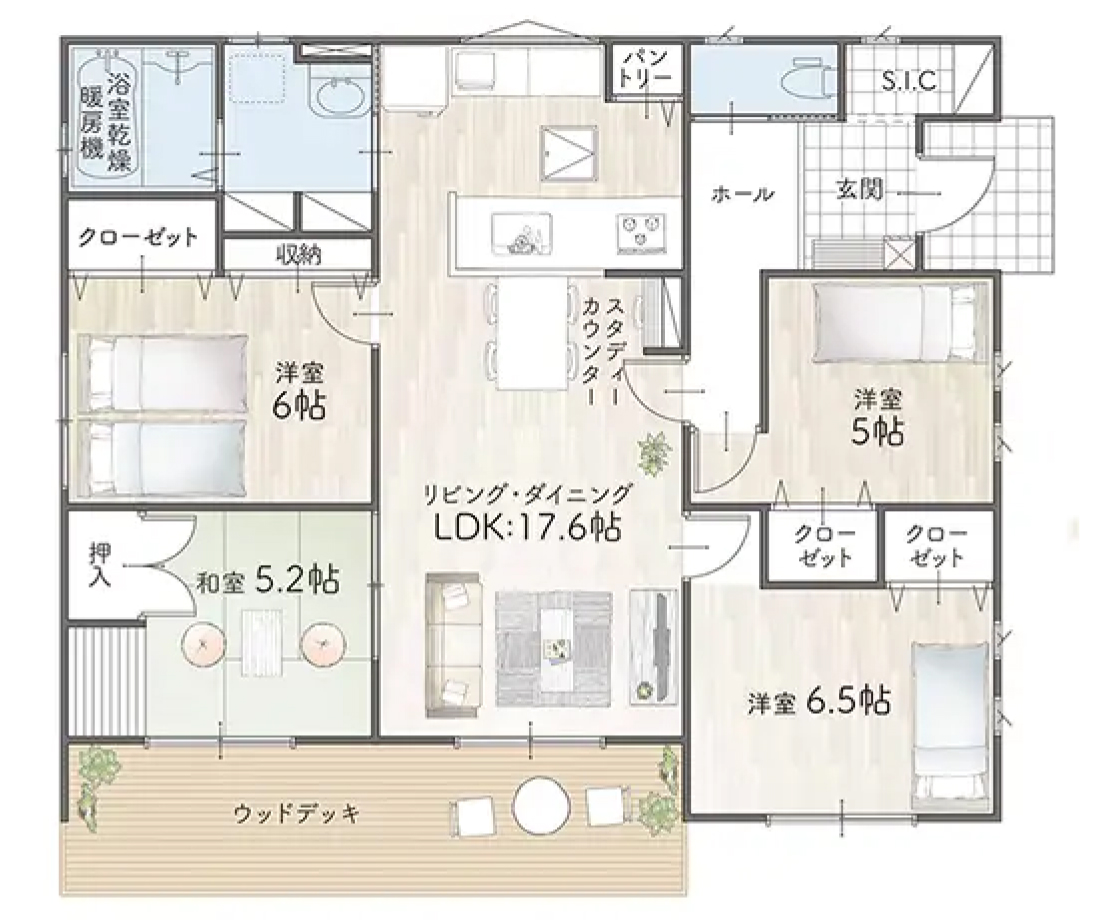 西側にリビングに直結する2部屋、東側にはホールを挟んで独立性の高い2部屋を配置。プライベート空間と家族とのコミュニケーション空間のバランスに優れた間取りです。