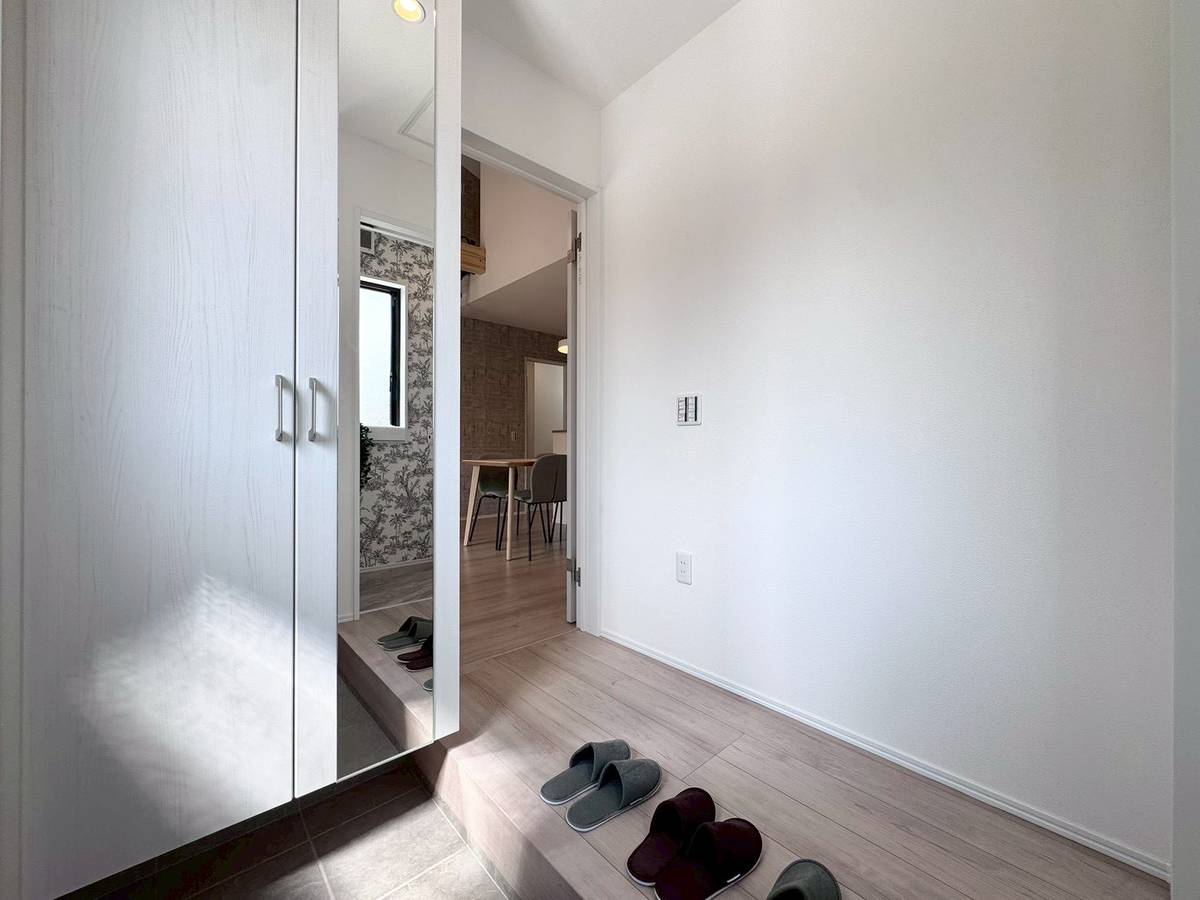 北東向きの玄関からは、柔らかな朝日と爽やかな風を迎え入れます。リビングは家族が自然と集う心地よい空間を提供し、快適な家族生活を支える設計です。